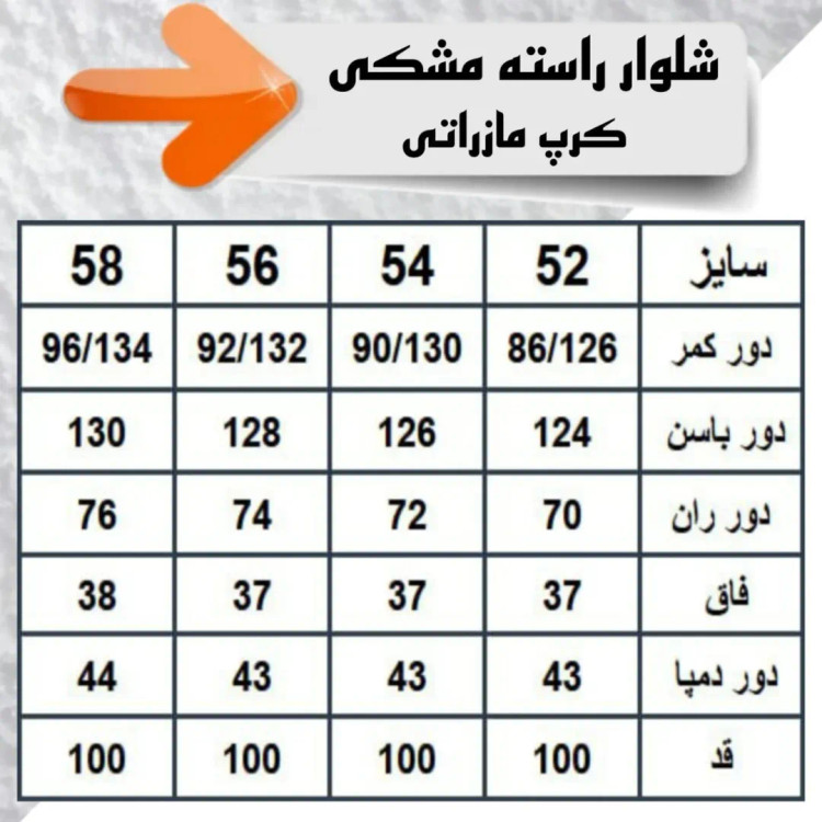 ق/ی/م/ت (ار/س/ا/ل را/ی/گ/ا/ن با پ/س/ت پ/ی/ش/ت/از) شلوار راسته مشکی پارچه کرپ مازراتی اعلا پشت کش دکمه خور وزیپ خور و دارای بند کمر فاق بلند با قواره های خوب پارچه نرم و لطیف عیار پارچه بالا هست و به هیچ عنوان دون دون نمیشود سایز ۵۲ مناسب ۵۲و۵۴ سایز ۵۴ مناسب ۵۴و۵۶ سایز ۵۶ مناسب ۵۶و۵۸ سایز ۵۸ مناسب ۵۸و۶۰