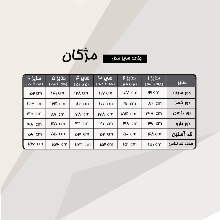 سایز ها : سایز 1 (38 تا 40), سایز 2 (42 تا 44), سایز 3 (46 تا 48), سایز 4 (50 تا 52), سایز 5 (54 تا 56), سایز 6 (58 تا 60)